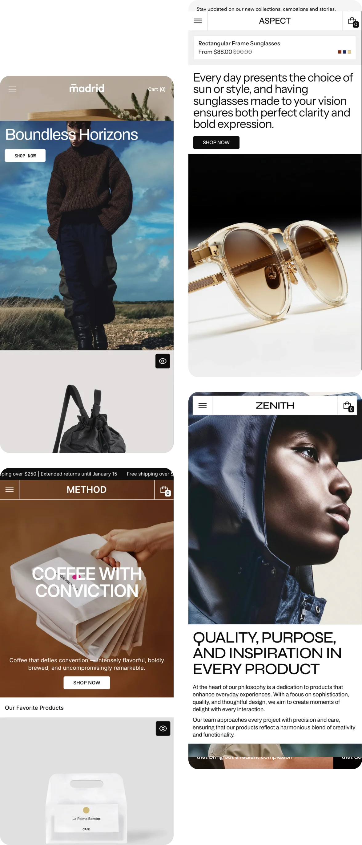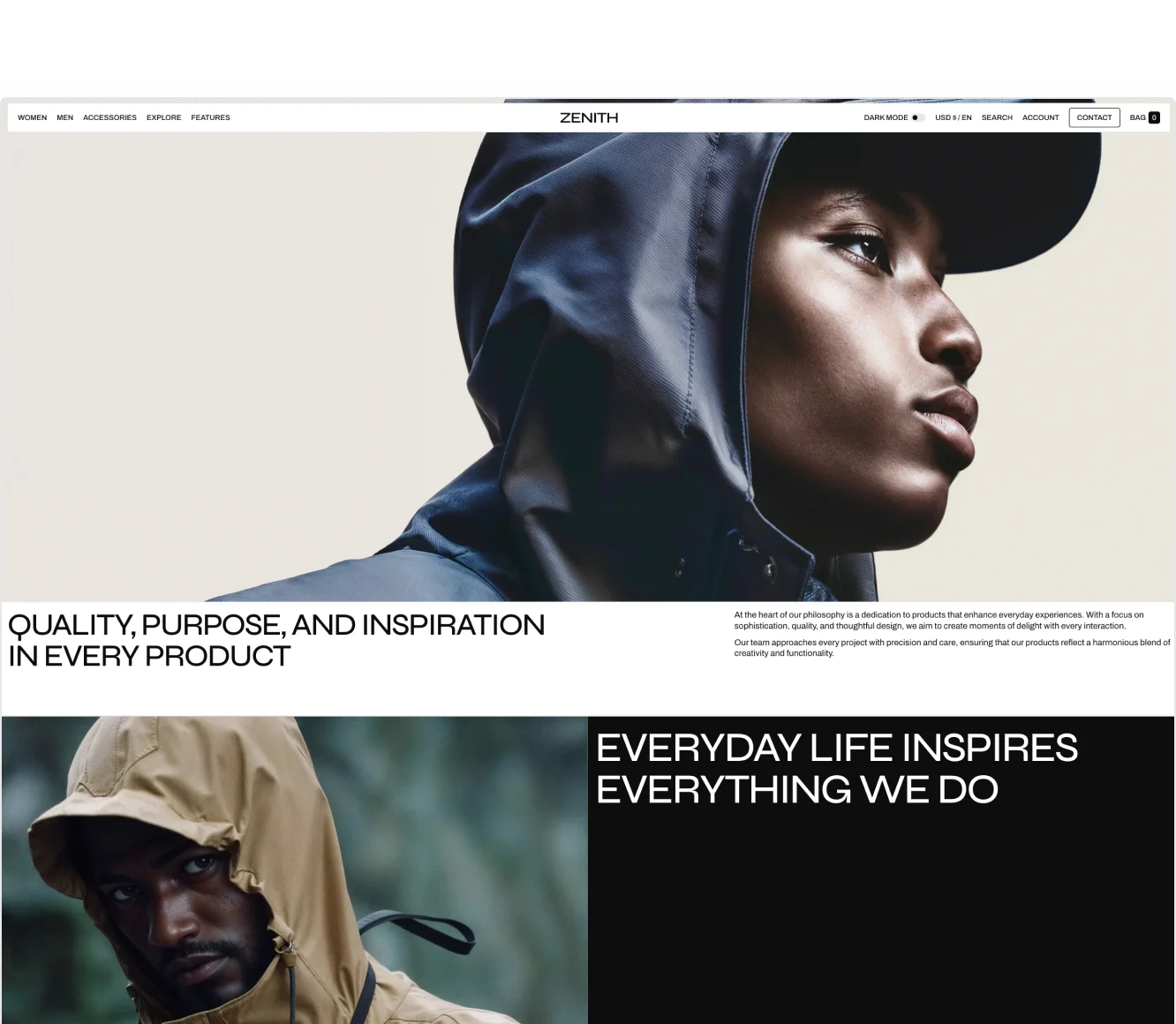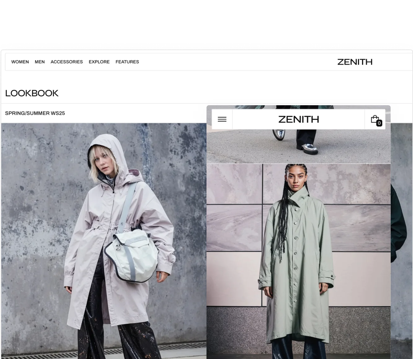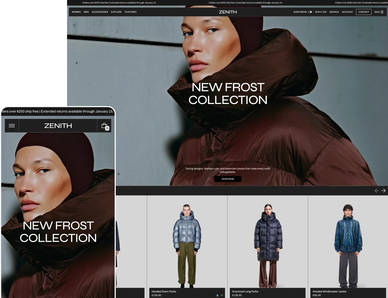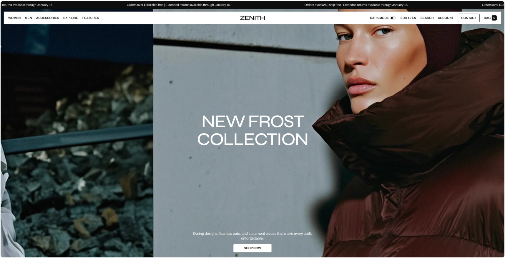 Designed for brands that value style and impact, Zenith showcases your products with refined design, captivating visuals, and immersive storytelling that creates a memorable shopping experience.