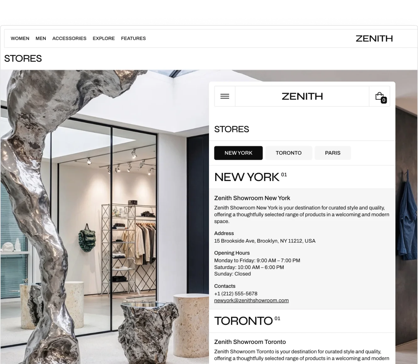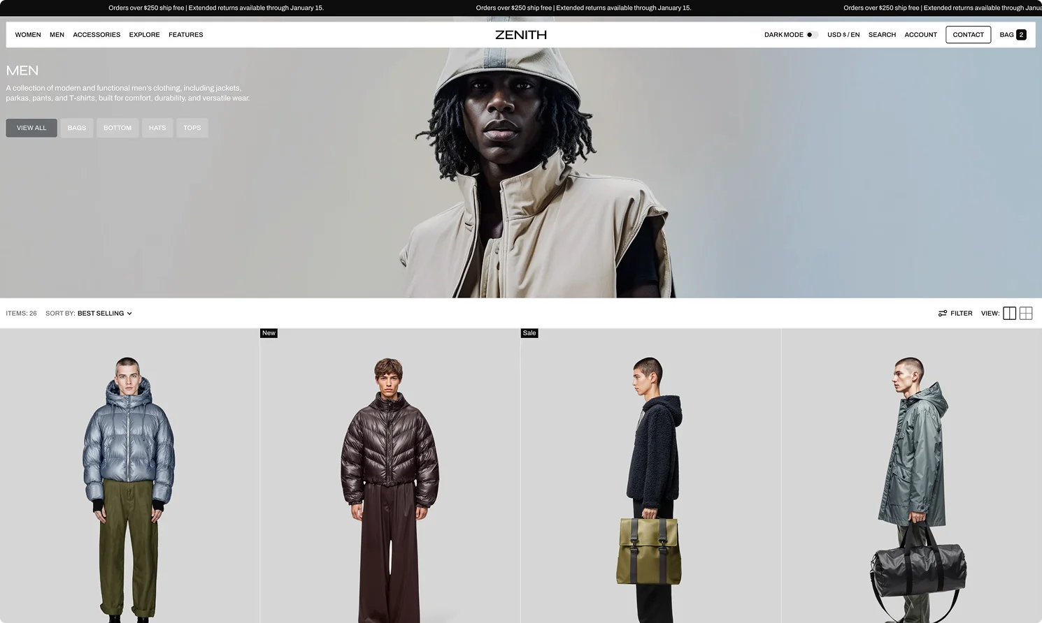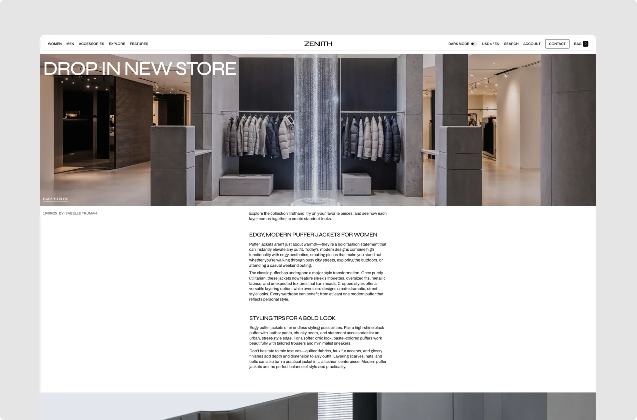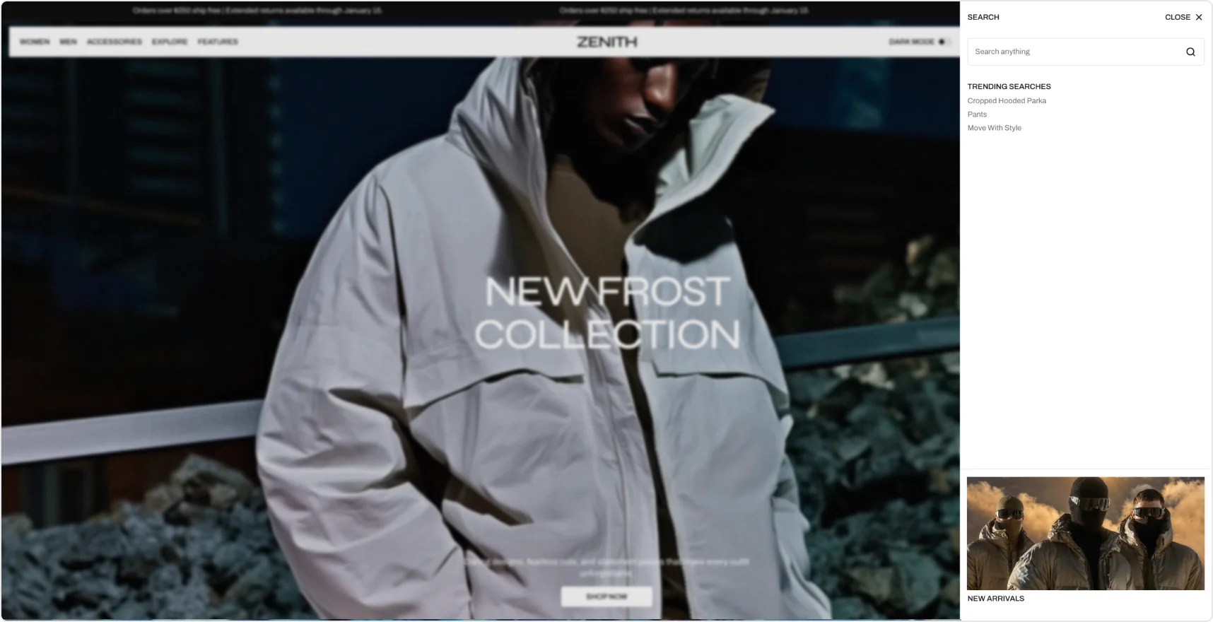 Designed for brands that value style and impact, Zenith showcases your products with refined design, captivating visuals, and immersive storytelling that creates a memorable shopping experience.